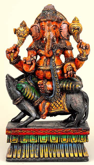 The fine figure of the Lord Ganesha is given an exquisite treatment with some beautiful designs. The Lord is seated on a mouse, his vehicle. He is the Lord of Wisdom and the Remover of Obstacles, as the Lord is the repository of Wisdom. He is holding conches on his two hands. He is invoked before a child is initiated into formal learning process. The beautiful figure of the Lord creates a sense of satisfaction and accomplishment. One of the most-revered gods in Hinduism, Lord Ganesha is worshiped first among all the gods. One of the most benevolent gods, Lord Ganesha is also known as Agra Ganya.