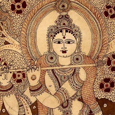 The spectacular Kalamkari painting exalts the legacy of the Kalamkari tradition. Lord Krishna has been nicely painted here with a sublime finesse. Lord Gopal was the apple of an eye for the Gopis in Vrindavan. His childhood escapades constitute a lively discourse in Indian literature. The kalamkari goes through a vigorous process of resist dyeing and hand printing. Kalamkari painting goes through a lot of treatment before and after the painting is done on the fabric. The colours change depending on the treatment of cloth and quality of the mordant. Every step in the process is painstakingly done and with perfection. Kalamkari paintings have a flourishing market in and outside the country.