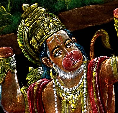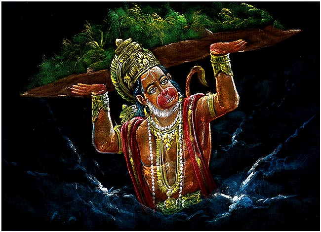 The resplendent velvet painting of the Lord Hanuman is given a refine and detail treatment. Lord Hanuman is a great devotee of Lord Ramchandra, the key figure in the great Hindu epic Ramayana. Hanuman played a pivotal role in rescuing Seeta from the clutches of Ravana. When Lakshmana, the brother of Ramchandra was injured at the battle, Hanuman was sent to bring Sanjeevani, a specific herbal hill. Unable to identify the particular herb, Hanuman brought the entire hillock. In this beautiful painting, the Lord is painted holding the hillock with his both hands. The Lord is a symbol of great strength and prowess.