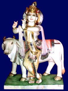 Lord Krishna is one of the most revered and loved Hindu deity. He is the hero of the epic Hindu text, Mahabharta, and is shown here as playing the flute. He was brought up by his foster father, King Nanda, who was the leader of cowherds. Shown here, behind Lord Krishna is a cow, one of the several he used to charm with the divine music from his flute.