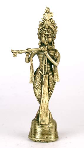 In this spectacular dhokra statue, the Lord Krishna, the popular deity of Hinduism, is crafted playing his flute. His immortal tune of love mesmerised the young ladies (gopis) in Vrindaban. Precision of a surgeon, flawless designs mark the figure. The figurine attests to the excellence of the dhokra artists. Their deep desire to preserve their fine arts is manifest here. Literally meaning "oldest," dhokra is a crafting tradition dating as far back as 2000 B.C. Dhokra art is largely associated with the tribal groups of northern India, including Vindhyas and the Eastern Ghats, Bihar and its surroundings, Orissa, Madhya Pradesh and West Bengal. Myriad images are cast in the dhokra tradition as artisans preserve their millenary culture, custom and belief through the wondrous pieces they create.