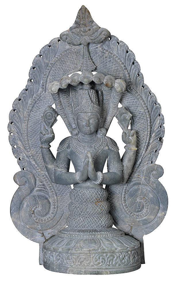 Here Orissa soft stone is nicely used to carve out the beautiful figure of Patanjali. Here not in a single piece of stone is used as a number of stones are put together. The beautiful stone figure of Adisesha Patanjali is given a refine and minute treatment. Patanjali, the great yoga acharya is also believed to be an incarnation of Adishesa, who is the first ego-expansion of Vishnu, the manifestation of Vishnu. His primeval energies and opulences, is part of the so-called catur vyūha, the fourfold manifestation of Vishnu. Thus may Patañjali be considered as the one incarnation of God defending the ego of yoga. Patanjali is the compiler of the Yoga Sutras, a major work containing articles on the philosophical aspects of mind and consciousness. He is also the author of a major commentary on Panini's Ashtadhyayi.