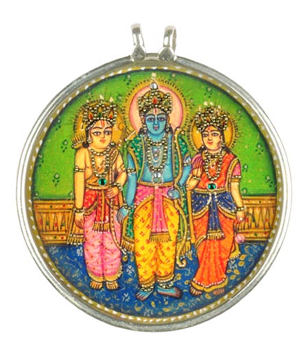 The beautiful Silver pendant depicts Lord Ramchandra and His wife Sita along with His brother Lakshmana in a most refine manner. A finishing touch is given in the beautiful pendant with a rare mix of colours and designs. On His left is Sita and Lakshmana is standing on Ram's right. They were wearing some beautiful dresses and spectacular ornaments.