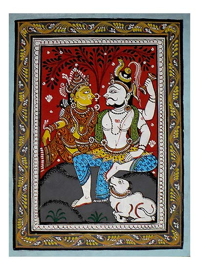 In this spectacular Patachitra painting, Lord Shiva and Parvati are sitting face to face. They are wearing some spectacular ornaments. Nandi, Lord Shiva's vehicle, is also sitting nearby. The cosmic couple Lord Shiva, one of the Trinity Gods in Hinduism, and Parvati are given a refine and detail touch with a deep sense of accomplishment. Lord Shiva and Parvati are considered the most ideal couple by Hindus and they are worshiped all over the subcontinent. Patachitra is a popular genre of ethnic painting in Orissa and was born out of the cult of God Jagannath, the presiding deity of Orissa temple. Spectacular pictorial conceptions, characteristic conventions and vibrant color patterns make the Patachitra a unique treasure in the rich coffer of Indian ethnic art. Primarily executed on cloth, using natural colors, these ethnic paintings have charmed admirers across the globe.