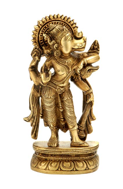 Even after much effort, Brahma was not able to think of any solution. At last, he took shelter of the Supreme Lord Visnu. While Brahma was still deep in thought, a small boar the size of the tip of a thumb manifested from his nose. But the most surprising thing is that the small boar expanded in front of Brahma and within moments, filled the sky and assumed a form as big as an elephant. Brahma, together with the great brahmanas like Marici, as well as the Four Kumaras and Svayambhuva Manu saw the transcendental Varaha form and began to discuss among them. Lord Brahma thought that this was some denizen of the transcendental world in disguise; traveling in the form of a boar.