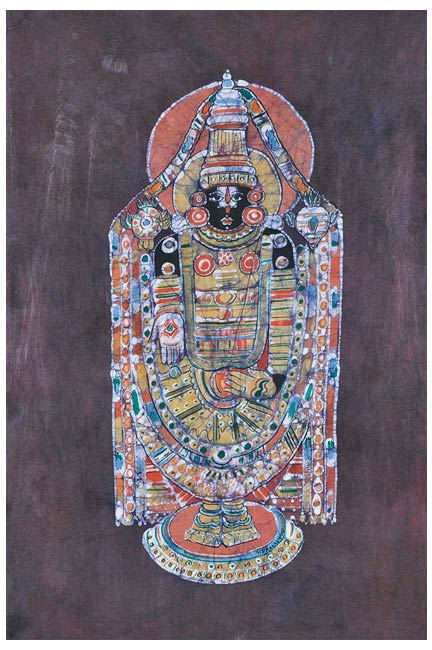 In this Batik painting popular god Venkateswara, who is also known as Srinivasa, Balaji and Venkatachalapati is given a prolific treatment with variegated colours being used in abundance. He is a form of the Hindu god Vishnu. Venkateswara is a god who destroys the sins of the people. According to the Hindu mythology, Lord Vishnu, out of his love towards his devotees, incarnated as Venkateswara and appeared for the salvation and upliftment of humanity in this Kali Yuga age. He is considered the supreme form of Vishnu in this age. The Venkateswara swami temple is also called Kaliyuga Vaikuntam.