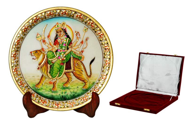 The marble beautiful painting depicting the image of Ma Sherawali reveals some of the basic features of a feminine goddess and her eight hands are shown carrying different weapons. She is painted blue and seated on a tiger. The roaring tiger is also beautifully treated and the figure painted on a round block reveals some of the beautiful carvings on it.