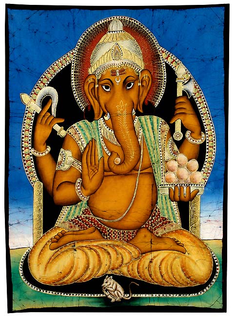 The beautiful painting of Lord Ganesha holding sweets on his one hand is given a refine and detail treatment in the traditional Batik style. Lord Ganesha, one of the most revered Gods in Hindusm, has been beautifully painted in the Batik setting. Lord Ganesha is also known as the Lord of wisdom and is always worshipped at the beginning of any ceremony for the well being of the worshipper. The gracefulness of the painting is evident in the calm and quite posture of the Lord. The method of waxing and dewaxing has added beauty to the painting. One of the most benevolent Gods in Hinduism, Lord Ganesha can be easily propitiated offering sweets, as sweets are his favourite food.