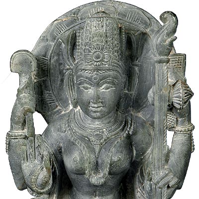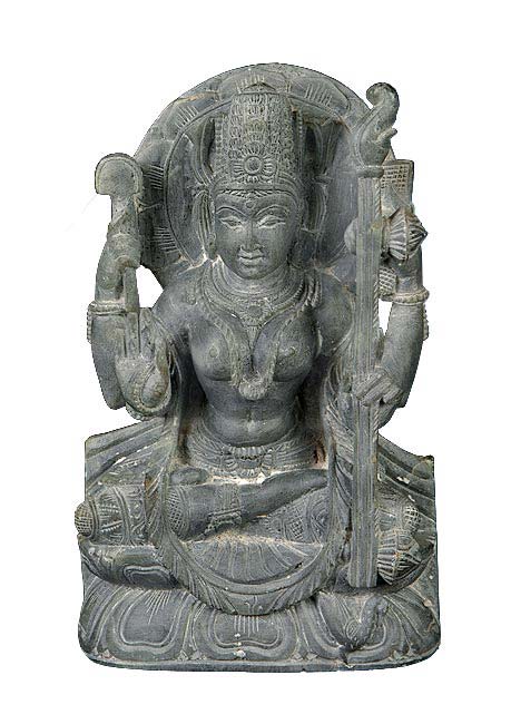 The stone image of mother goddess Sharda has been nicely carved out by the sculptor. The figure has been treated giving prominence to various parts of the body of the mother goddess. She is blessing her disciples with her one hand and is wearing lot of ornaments. Her breasts are prominent and the goddess is sitting with crossed legs. The beautiful gray image of the mother goddess has some nice sculptural carvings on it.