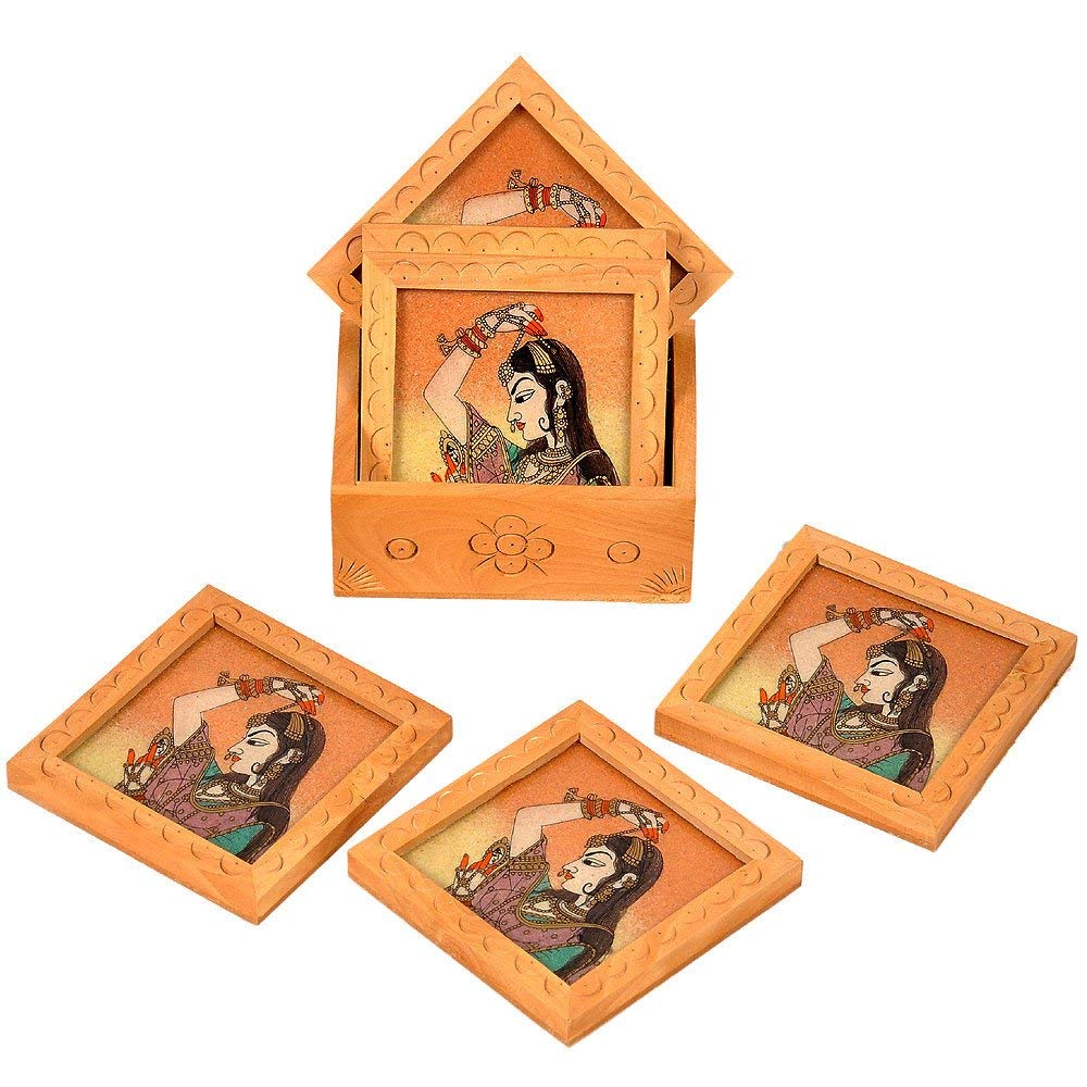The beautiful and traditional set of 6 wooden handcrafted square shaped tea coasters with wooden box is an elegant pick for home decor whether it is your drawing room or dining space. The utility item is handmade with finely crushed real gemstones on a glass base by the master artisans of Jaipur.