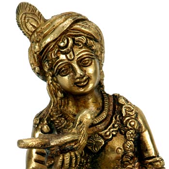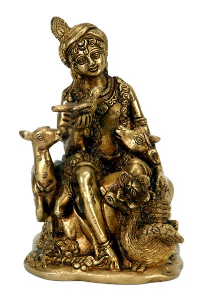 The figure of Lord Krishna as an epitome of deep love for all the creations is being beautifully chiseled out of brass by the sculptor. His face reveals a caring and tender touch as he is holding the animals. The meek deer are looking at the Lord. His turban, face, the animals all have been given a royal treatment.