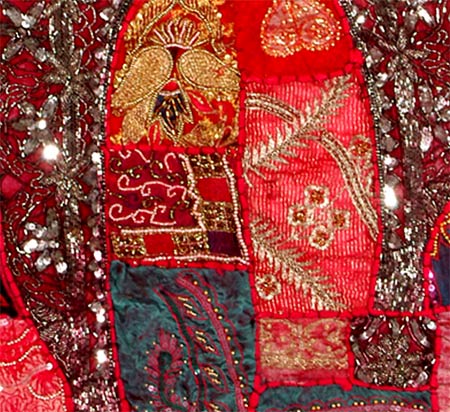 The beautiful wall hanging is a paradigm of beauty and enhanced with patchwork, sequins and beadwork, this splendid wall hanging exemplifies Gujarati textile art. The motifs are also carefully embroidered by hand, making each piece wonderfully unique. The craft of patchwork has been passed on from generations and is still practiced by the natives of Gujarat and other North West Indian states. The borders of the wall hanging have been painted gray.