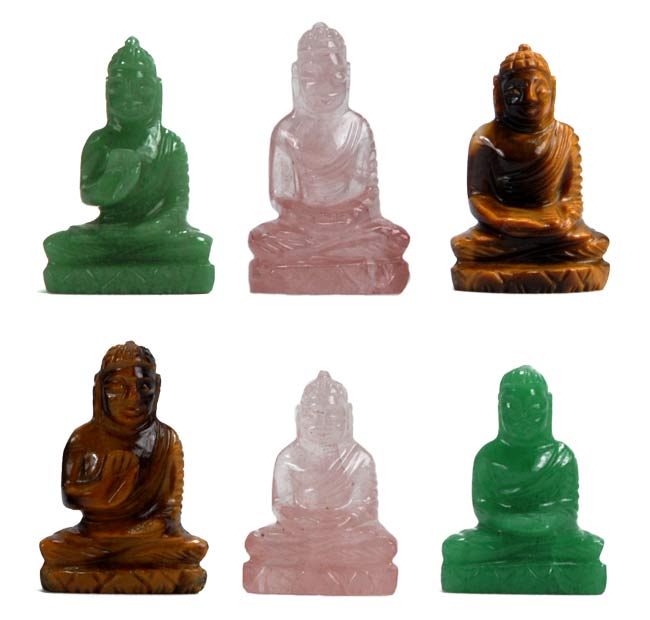 The beautiful images of the Precious Buddhas have been nicely carved out in a most delicate manner. The miniature statues have been carved out of rose quartz, green aventurine and tiger eye stone to give the Apostle of Truth and Non-violence a splendid portrayal. The figures are in meditative posture and two figures are being shown blessing the devotees. They show a deep sense of aesthetic appreciation and excellence. Lord Buddha gave up the lap of luxury in search of the truth and ultimately found the middle path for the lay men. He is also considered an incarnation of Vishnu.