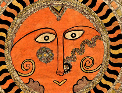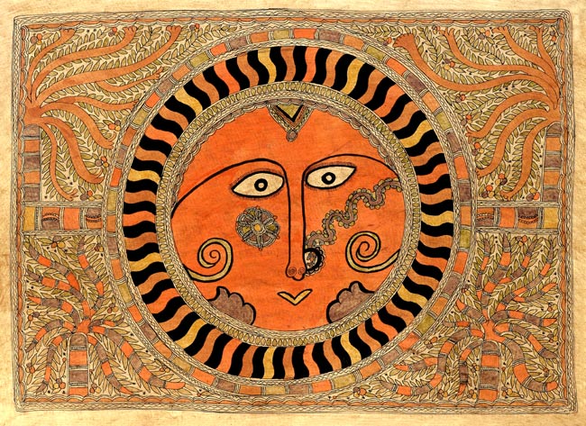 Magic of Mithila, the beautiful Madhibani painting depicts a simple goddess in human form. Madhubani is a refine form of painting popular in the Mithila region of Bihar and the painting uses natural dyes. Simple local as well as mythological motifs are being regularly used in this form of painting by the artists. Madhubani is mainly practised by the female artists. He eyes are prominent and there are some beautiful floral motifs.