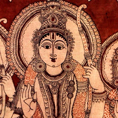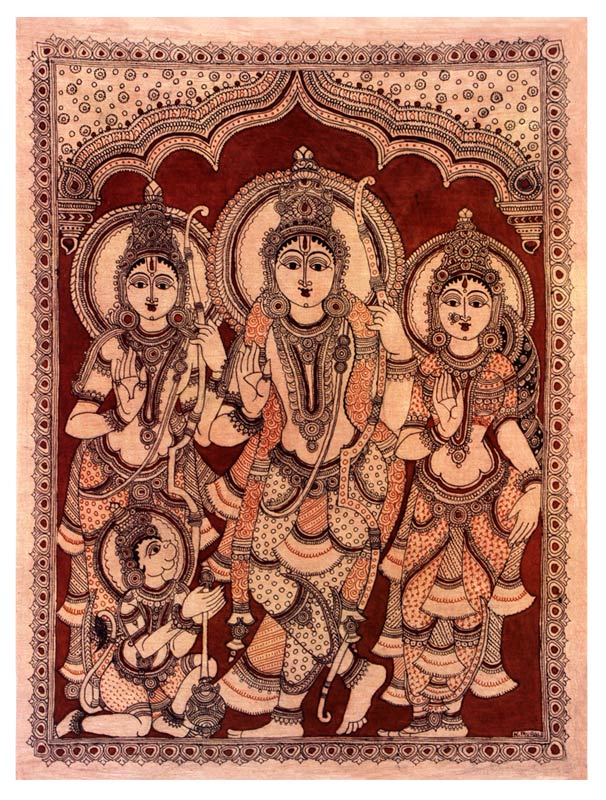 Lord Rama is one of the most popular mythological figures in Hinduism and is worshipped with great devotion. Lord hanuman is a classic example of devotion to the Lord. The Kalamkari Painting on fabric depicts the court of the Lord Ram in a most exquisite manner. Use of natural dyes for depicting variegated colours is the unique feature of this form of painting.