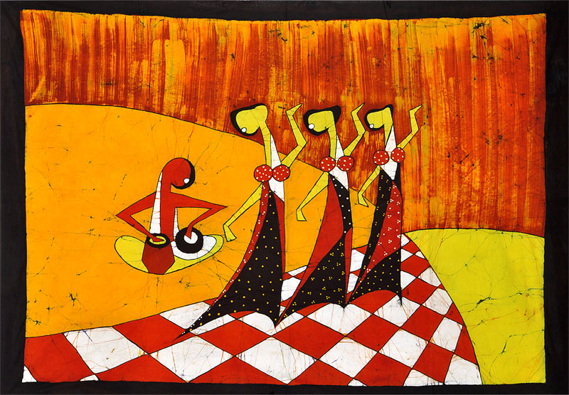The three ladies are dancing to the tune of the tables being played by the man. Sheer line formations and colour patterns have given the painting a beautiful impression. The method of removing the waxes from the painting has created a beautiful impression in the painting. Batik prints are very popular in traditional Indian art forum and these paintings from West Bengal, Orissa and Tamil Nadu are known for their originality, uniqueness and fineness. Batik is the art of creating images on the cotton cloth using wax resist method.