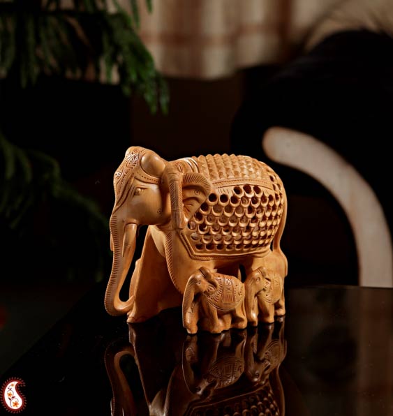 Beautifully hand carved Elephant with intricate jaali work and an elephant inside the elephant and two tiny elephants at the foot to give it a feel of a herd is sure to look great on a table as a centre piece.The whole statue is carved out of a single wooden piece.