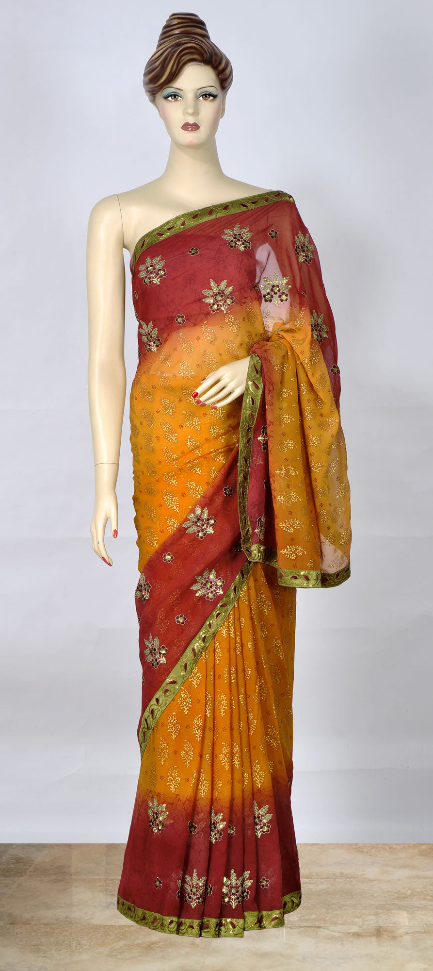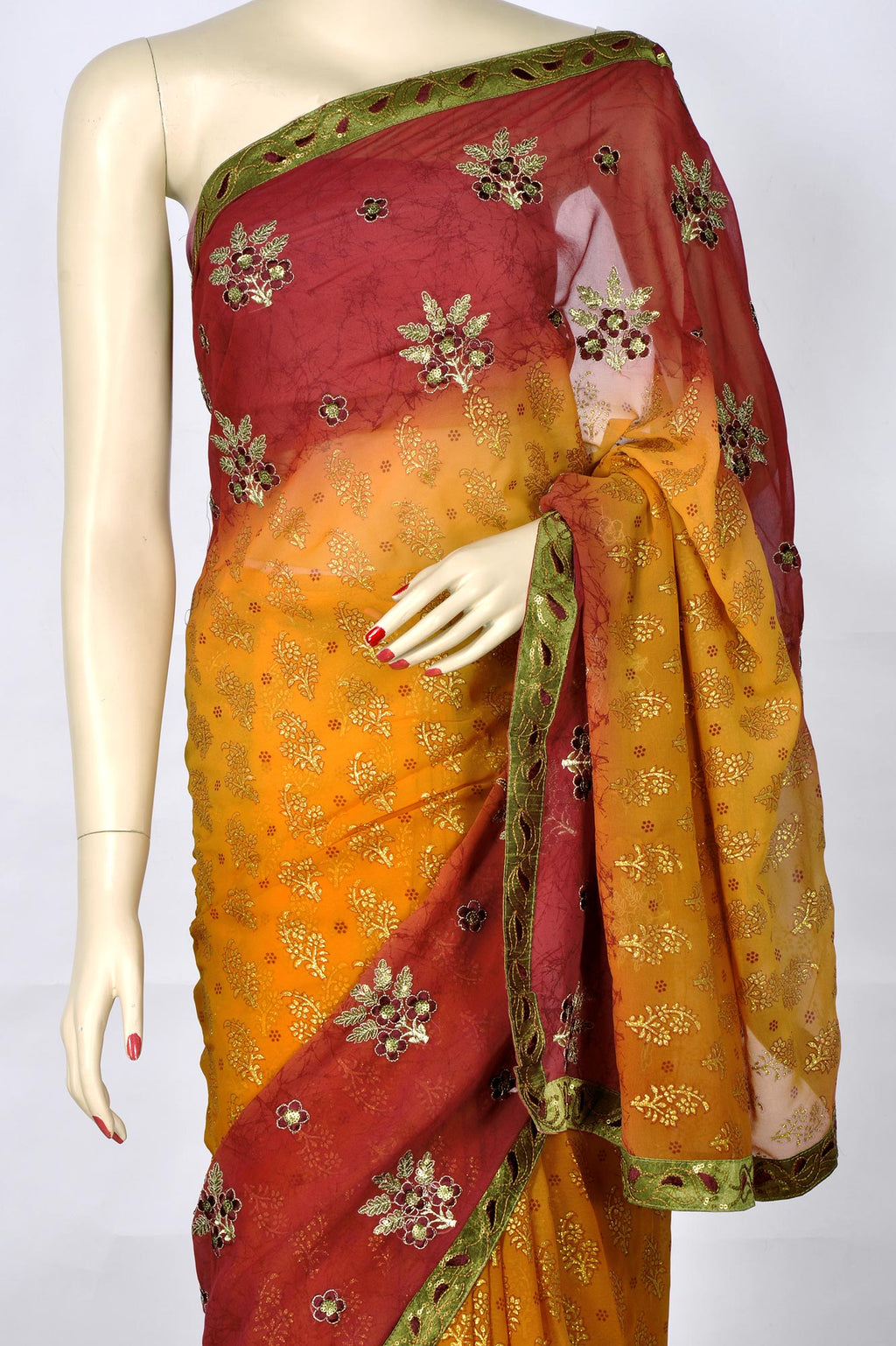 The gorgeous georgette saree contains some dashing embroidery booti works on it and the rust and maroon colour of the saree makes it a quite fashionable piece and every lady will love to wear the piece for any special occasion. There are some brilliant floral designs in the saree and you may also order add order for blouse stitching, fall and edging and stitched underskirt for a nominal payment. The borders of the saree are also beautifully designed giving it a modern and more fashionable look. An integral part of our society, heritage and lifestyle, saree is indeed the six yard wonder drape that makes every woman look amazing.