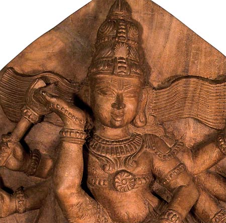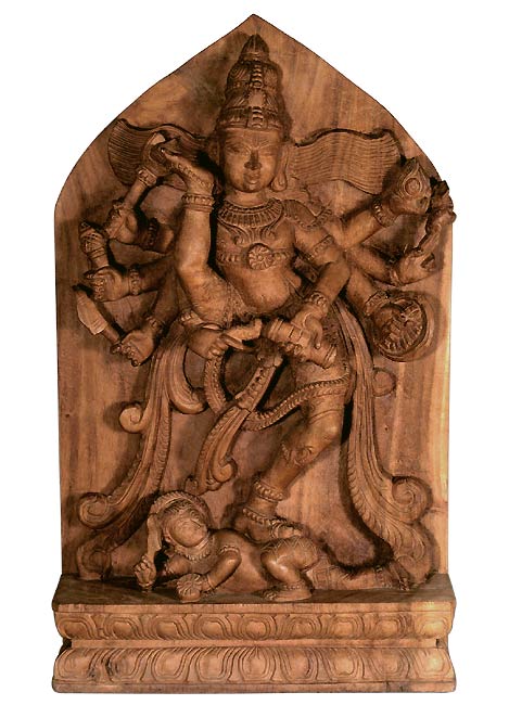 The beautiful wooden figure of Lord Shiva performing his cosmic dance is given a refine and detail treatment. Nataraja (The King of Dance) is the dancing posture of the Shiva, who performs his divine dance as a part of his divine duties of creation and destruction. The Lord Shiva is shown dancing in a circle of flames, lifting his left leg and balancing over a demon or dwarf (Apasmara) who symbolizes ignorance. It is a well-known scultptural symbol in India and popularly used as a symbol of Indian culture. The form is present in most Shiva temples in South India, and is the main deity in the famous temple at Chidambaram.