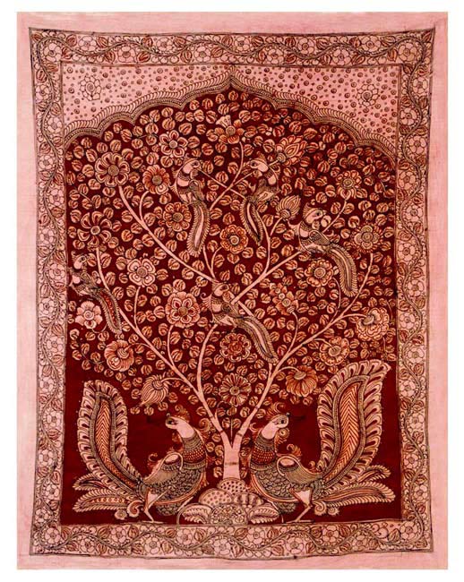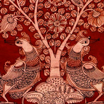 The Spring season, the queen of all seasons, has found a vivid portrayal in the Kalamkari painting. A paradigm of beauty, the art work is fine blending of sharp lines and colours. Light pink has been aptly used by the painter. The beautiful tree and its branches have been painted with a masterstroke. The peacocks have also been treated beautifully. Kalamkari is a traditional Indian craft predominantly related to cotton fabric. In this craft, fabric is patterned through the medium of dye rather than loom. Ochre is one of the few colors which cotton would take on easily The prominence of colours and the characters that emerge on cotton fabric, help create a resplendent spread in this form of art work. Kalamkari art is unique in its use of colour as a medium to portray mythological as well as mundane characters. Kalamkari is the art of painting cotton fabrics with a kalam i.e. pen, a sharp pointed pierced bamboo that regulates flow of colour on the fabric. Kalamkari colours are made from vegetable dyes. In addition to themes from the epics, Kalamkari leitmotifs comprise different forms of the lotus flower, the carwheel, parrots, an interlacing pattern of leaves and flowers.