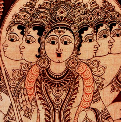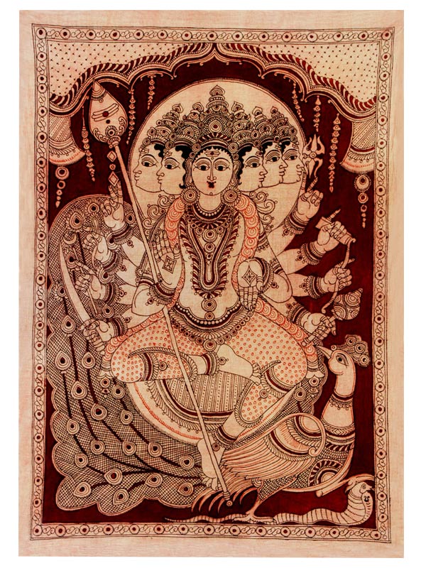 The six headed Subramaniyan Swami is decorated in a traditional Kalamkari style, one of the most popular style of painting in South India. He is shown sitting on a peacock with one hand blessing the devotees.His ten hands are holdng different objects. A rare smile is visible on his face. Kalamkari is an exquisite ancient craft of painted and printed fabrics. It derives its name from Kalam meaning Pen, and Kari meaning work, literally Pen-work. It is hand painting as well as block printing with vegetable dyes. Kalamkari art has evolved through trial and error over the last 3000 years. Techniques of craftsmanship in Kalamkari were handed down within the families from generation to generation. Kalamkari art has evolved through trial and error over the last 3000 years. Techniques of craftsmanship in Kalamkari were handed down within the families from generation to generation. Both Masulipatnam and Srikalahasti villages in Andhra Pradesh are recognised as major centres for Kalamkari Paintings.No chemical dyes are used in Kalamkari style of painting. Vegetable dyes are used to create paintings on fabric.
