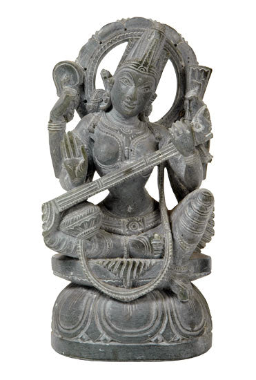 The beautiful image of Goddess Saraswati has been given a detail and refine treatment by the sculptor. Seated on a lotus, the figure reveals some nice carvings on it. Lord Vaagdevi is the goddess of learning and she is worshipped by the students as well as by the musicians. She is shown holding a veena and the figure reveals some basic feminine features and gracefulness.