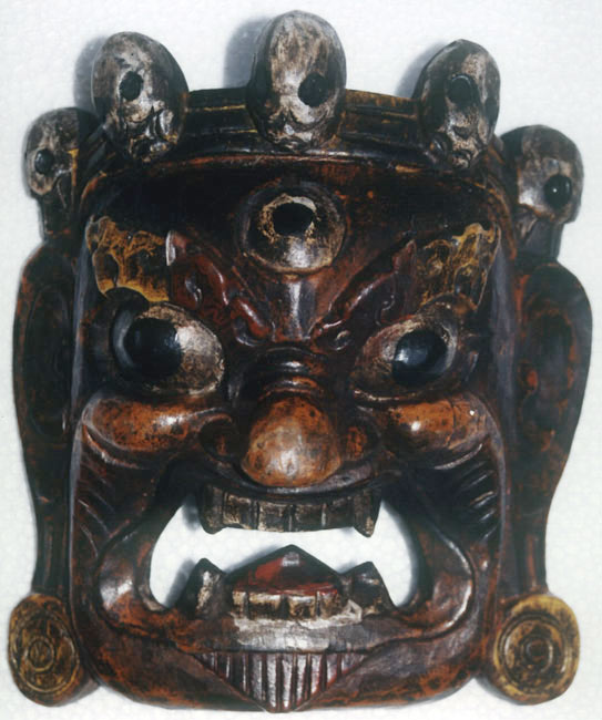 The artist has captured fieriness of Lord Bhairava very finely in this mask.This wooden mask is carved and painted with details and mastery by the Nepali craftsman.