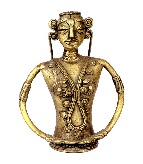 The image of the Bastar tea garden worker has been beautifully sculpted out of brass using the ancient dhokra technique. The figure contains some nice carvings on it and it reflects a sense of gracefulness and satisfaction. Dhokra is an ancient technique of crafting the brass statues and the lost wax method is applied to get the images. It is a laborious process associated with North Indian tribal groups. A model is sculpted of clay and dried in the sun; it is then covered with beeswax and more clay, forming a mold. The piece is cast, cleaned and again dried in the sun. Finally, it is heated in the ground for five days and polished.