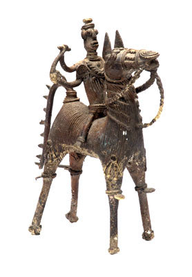 The Bastar treibal prince has been sculpted out of brass by the artists using the traditional dhokra technique. Crafted in the lost wax method, the prince is shown mounting on a horse. Both the prince and the horse are decorated well with some nice carvings on them. The image reflects some of the refine characteristics of the tribal art. Dhokra is an ancient form of sculpture practiced by the tribal population of Northern and Central India. They are using this method till date to preserve their cultural traits and heritage.