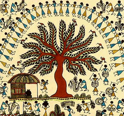 The village life is a hustle bustle of numerous activities and the rural folks remain engaged throughout the day. At dusk they come back home after day’s works. The painting has painted both the men and women busying their time with their works. The chain of women figures make the painting a must buy. Whereas some women are playing with the dhols some others are working their household chores. Some ladies are drawing water and some people are coming back home in the boats. Some ladies are playing with the kids. The trees, the bullock carts, the animals all have made the painting a quite impressive one. Use of natural dyes, sharp lines all are basic tenets of a Warli painting. The artist has made use of the pen and natural dyes on fabrice quite impressive manner.