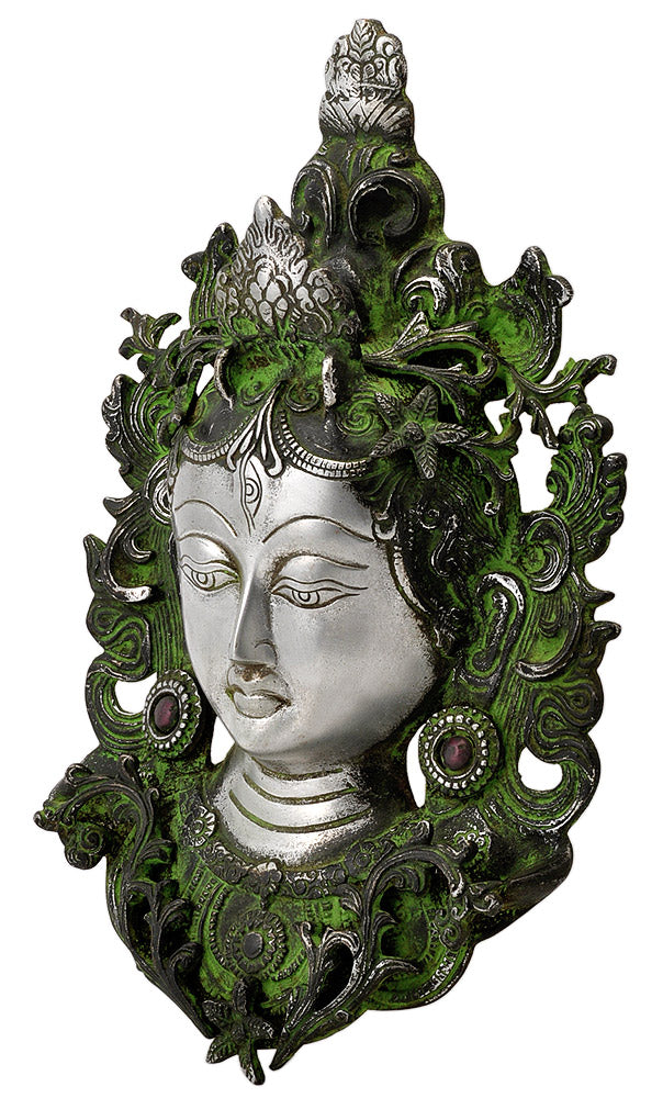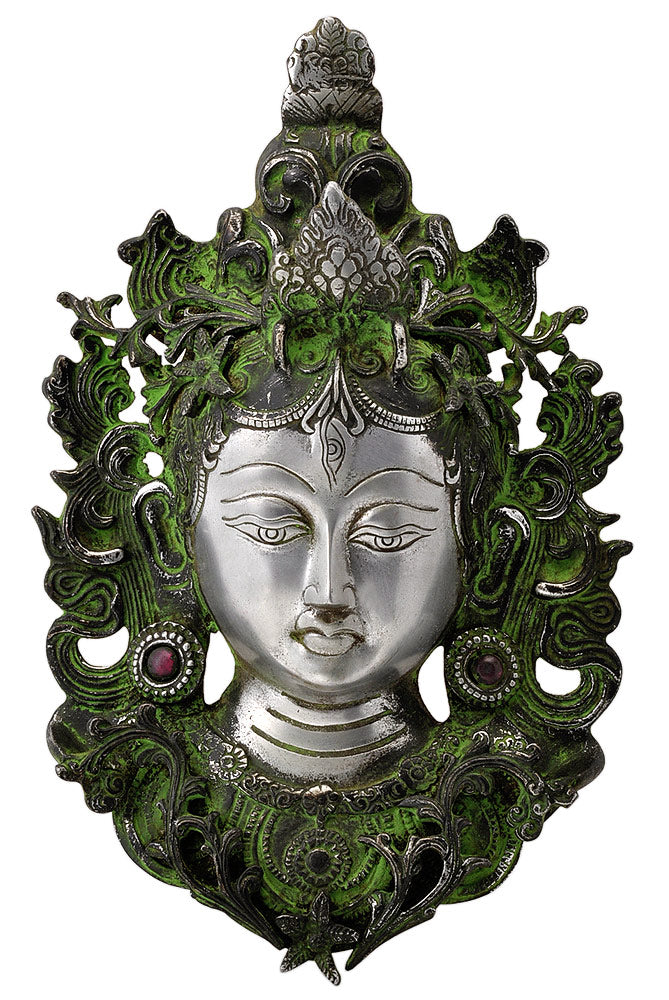 The beautiful mask of Tara Devi is refinery treated. Her eyes are broad. She is wearing long ear rings. Her face is finely treated. Even the headgear is nicely carved. One of the most important deities both for the Hindus and Tibetans, she plays an important role in Tantrik cosmology because mantra, words, music are considered to be the very source of the cosmos. Tara is a female Bodhisattva in Mahayana Buddhism who appears as a female Buddha in Vajrayana Buddhism. She is known as the "mother of liberation", and represents the virtues of success in work. Tara is a tantric meditation deity whose practice is used by practitioners of the Tibetan branch of Vajrayana Buddhism to develop certain inner qualities and understand outer, inner and secret teachings about compassion and emptiness. Tara has many manifestations. Green tara is known as the Buddha of enlightened activity. White tara also known for compassion, long life, healing and serenity. Red tara of fierce aspect associated with magnetizing all good things. Black tara is associated with power. Blue tara is associated with transmutation of anger.