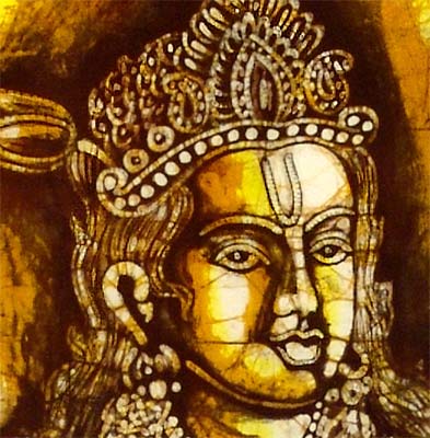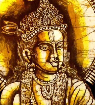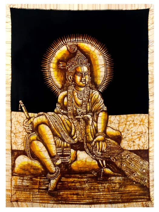 The benevolent Lord Gopala has been painted in the traditional mono-colour method of the Batik Style. On the one hand he has been holding his flute and on the other hand he has been offering his love to the peacock, a sign of benevolence. An original batik painting from our iventory. Batik is the art of creating images on the cotton cloth using wax resist method. Once the waxes are carefully removed this gives a special beauty to the painting,clearly shown in this painting