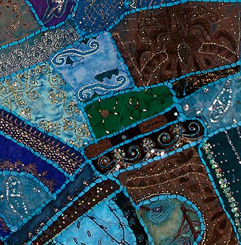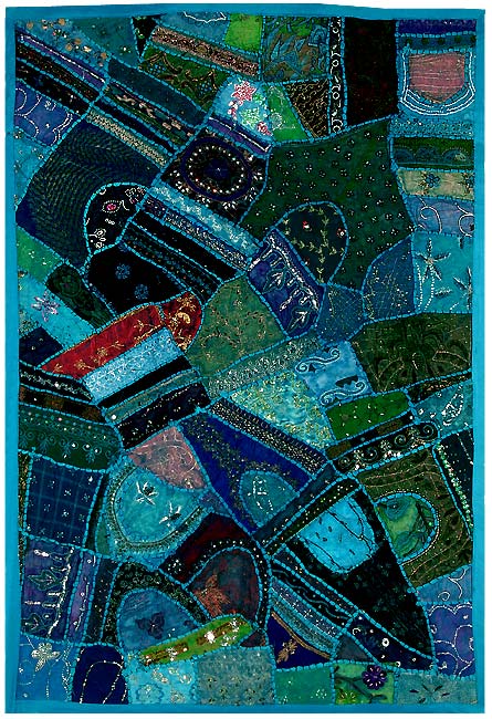 The beautiful wall hanging depicts the beauty of blue colour in a most attractive manner with some sparkling embroidery works on it. A number of floral designs have been put together in the amazing wall hanging. A fine embroidery work dazzles in the wall hanging revealing the rich traditions of patch work in Gujarat. The boundaries of the wall hanging are marked blue. Beautiful mirror works dazzle in the product like shining stars.
