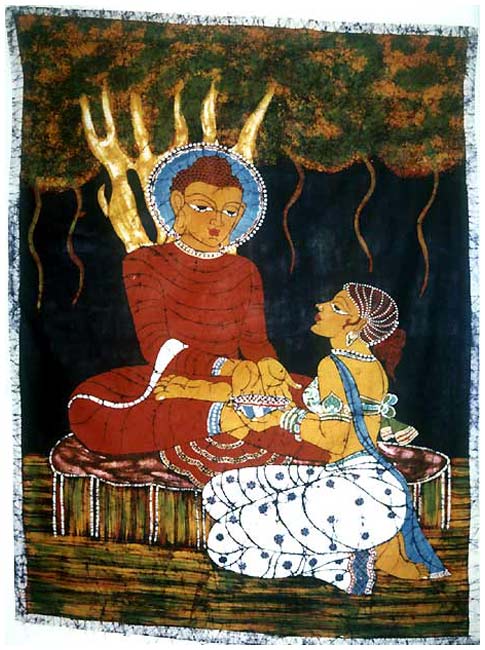 The beautiful Batik painting depicts the Lord Buddha initiating his wife charming Yashodhara into the fold of Buddhism. The feminine feature of the charming lady is evident whereas the Buddha’s figure depicts a gracefulness and gravity. Batik is one of the ancient forms of paintings in India and it is a kind of wax painting on cotton fabric. The method of dewaxing gives rise to special effect in the painting.
