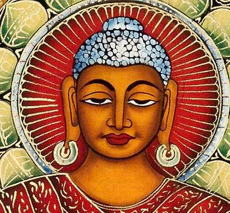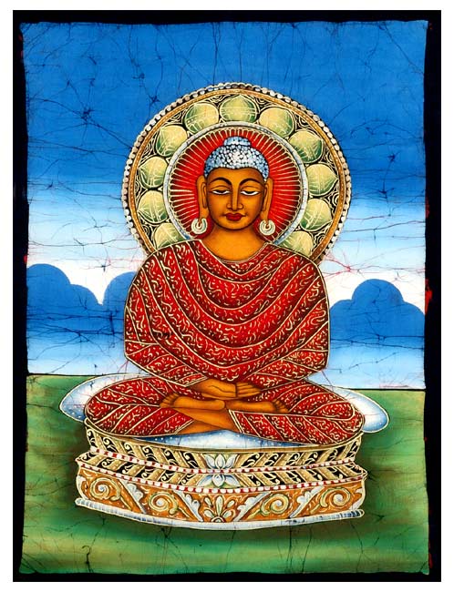 The light blue colour sparkles in the amazing Batik painting that depicts Lord Buddha, the Apostle of non-violence and truth in a sitting posture. His red drapery is very attractive with some floral designs on it. Considered an incarnation of Vishnu, Buddha is also an important figure for Hindus. The method of waxing and then dewaxing has engendered a specific pattern of contrast, a special feature of the Batik Style of painting. The simplicity and gracefulness of the painting is attractive.