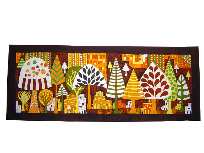 The beautiful Batik painting depicts the landscape of a city in a colourful manner. The buildings and the trees have been painted in different colours. Green and light yellow colours have been used in an impressive manner. Batik is one of the most popular forms of paintings in India and the method of waxing and then dewaxing gives special impact to this form of painting.