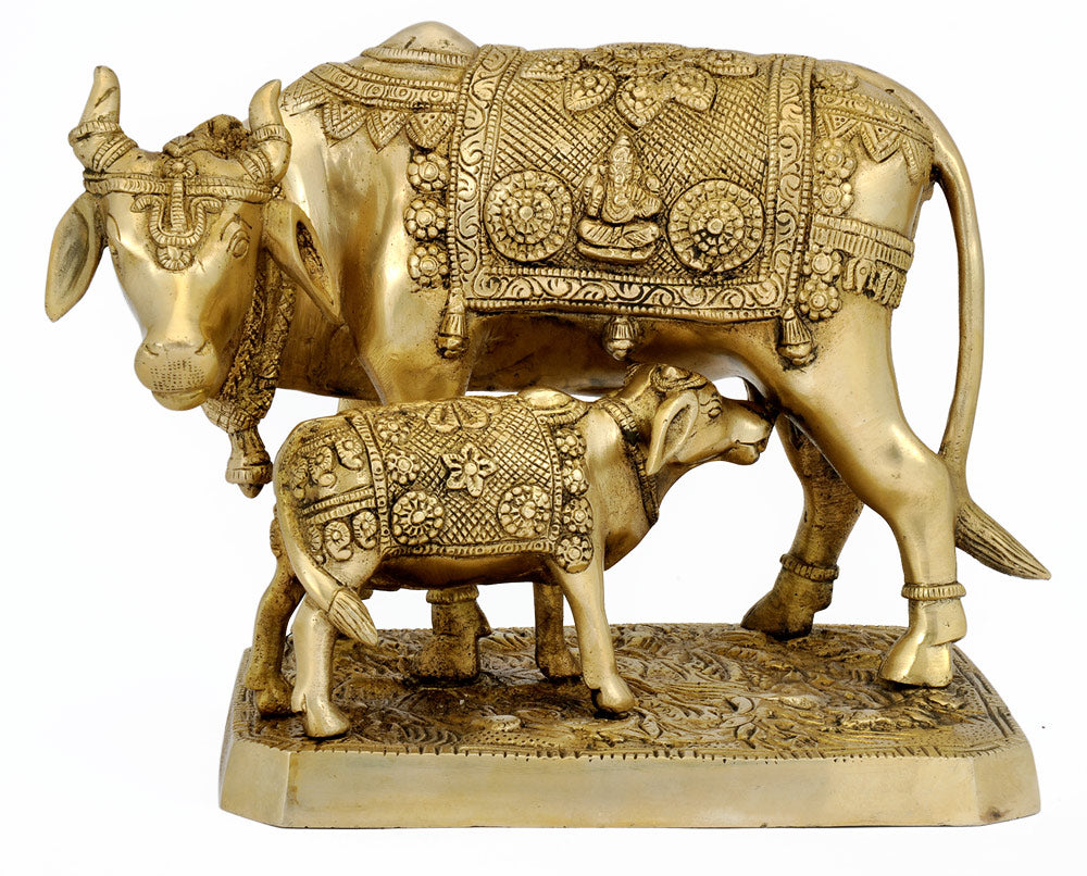 Simplicity, serenity and spectacular visual impact....the above brass figures of a cow feeding her calf have all of them. A real visual treat for onlookers, the figures are being crafted out with a deep sense for sculptural excellence and satisfaction. Some of the dazzling designs mark the beautiful product. A fitting tribute to mother cow, the figure celebrates the love a mother has for its child. The body of the cow is given a spectacular touch with some fine inscriptions on it. Every part of the figure is being nicely and minutely treated giving an over impression of satisfaction and glory.
