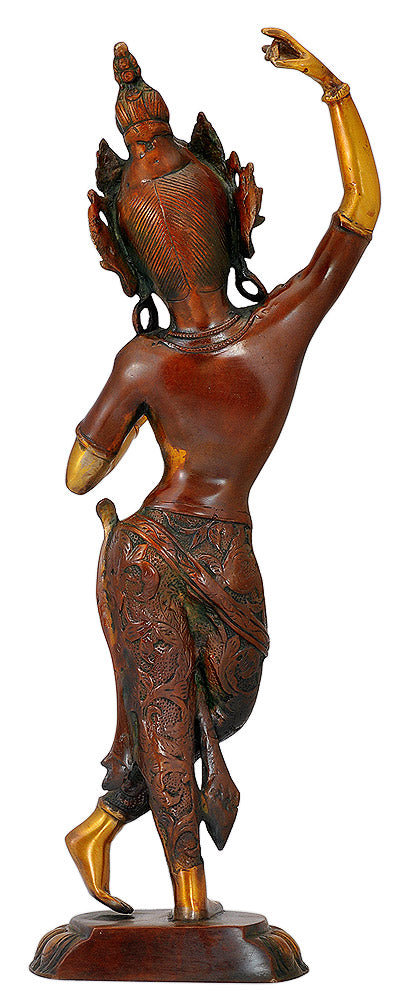 Devi Tara is a key figure in Buddhism, plays an important role in Tantrik cosmology. Here, the female deity is in a dancing posture. Tara Devi is the female Bodhisattva in Mahayana Buddhism who appears as a female Buddha in Vajrayana Buddhism. She is known as the "mother of liberation", and represents the virtues of success in work. Her practice is used by practitioners of the Tibetan branch of Vajrayana Buddhism to develop certain inner qualities and understand outer, inner and secret teachings about compassion and emptiness. The deity has many manifestations. Green Tara is the Buddha of enlightened activity, whereas White Tara also known for compassion, long life, healing and serenity. Red Tara of fierce aspect associated with magnetizing all good things. Black Tara is associated with power. Blue Tara is linked with transmutation of anger.