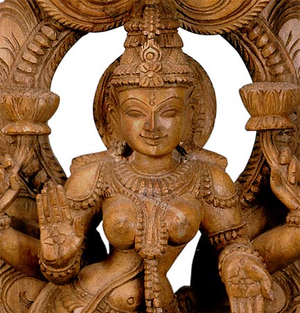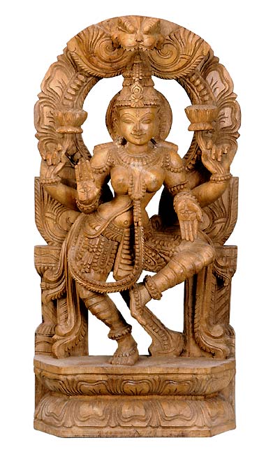 The beautiful figure of Goddess Lakshmi is shown in a dancing posture. The goddess is wearing a lot of ornaments and a number of beautiful carvings and designs have made the wooden figure a piece of beauty and respect. Lakshmi is the goddess of wealth and prosperity and she is one of the most worshipped-goddesses in Hinduism. Whereas the upper part of the body is relatively less-adorned, the lower part is covered with rich ornaments and clothes. An aesthetic sense of beauty and sensuality is manifest in the figure with her prominent breasts.