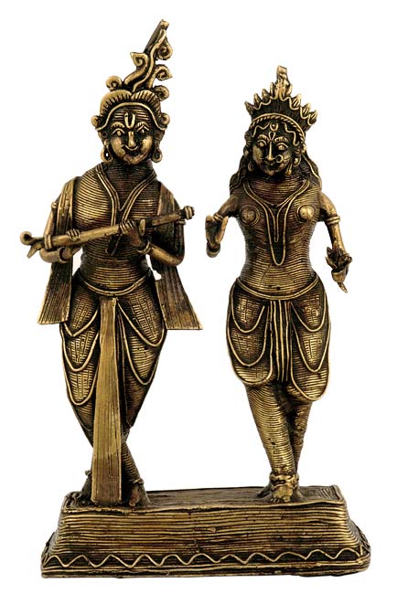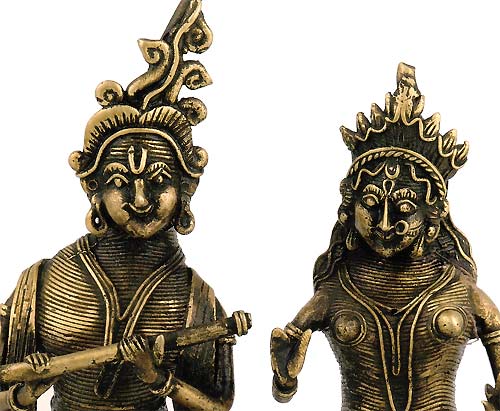 The splendid brass figures of Krishna, the human incarnation of Lord Vishnu and His Lover Dhokra Radha, are given a royal and refine treatment in the traditional dhokra method. The figures seem to have immortalized the deep love and affection between the two. Some spectacular designs and carvings characterize the figures. A deep sense of satisfaction and accomplishment is manifest as the Lord is holding his flute and Radha is smiling.