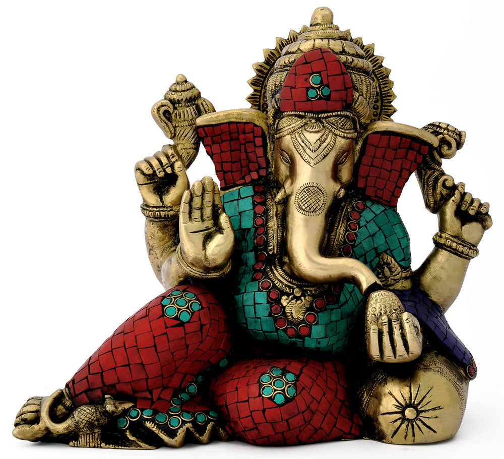Here the God of Wisdom and Good Luck is resting quietly and a sense of serenity is manifest. Brass, reconstituted turquoise and coral are extensively to make the figure look more colourful. The Lord is eating modaks and is at ease. His elongated ears, headgear, tusk—all are given a detail and minute treatment with a sense of elegance. The mouse, His vehicle, is also given a good touch. Son of Lord Shiva and Parvati, Lord Ganesha is one of the most popular gods and is worshipped first before invoking any other god. The Lord is known by as many as 108 names. He is Durja or the invincible. He is Devadeva, the lord of lords. He is Avighna (the remover of obstacles.)