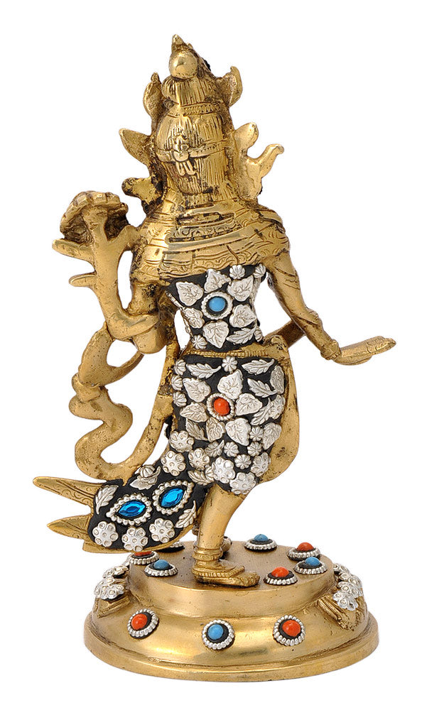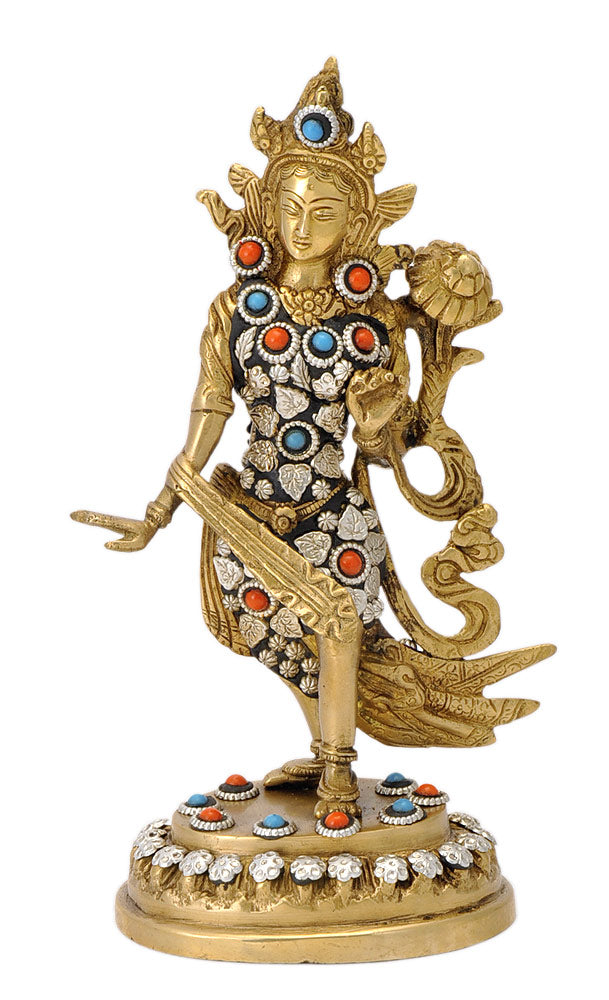 The brass figure of standing Devi Tara figurine is given a detail and minute treatment. The figurine is given an ornate touch as she is standing and wearing some highly ornate jewelries. Tara Devi, a key figure in Buddhism, plays an important role in Tantrik cosmology. She is the female Bodhisattva in Mahayana Buddhism who appears as a female Buddha in Vajrayana Buddhism. She is known as the "mother of liberation", and represents the virtues of success in work. Her practice is used by practitioners of the Tibetan branch of Vajrayana Buddhism to develop certain inner qualities and understand outer, inner and secret teachings about compassion and emptiness. The deity has many manifestations. Green Tara is the Buddha of enlightened activity, whereas White Tara also known for compassion, long life, healing and serenity. Red Tara of fierce aspect associated with magnetizing all good things. Black Tara is associated with power. Blue Tara is linked with transmutation of anger.