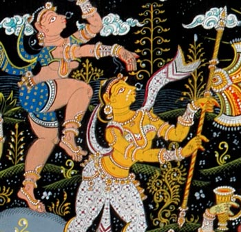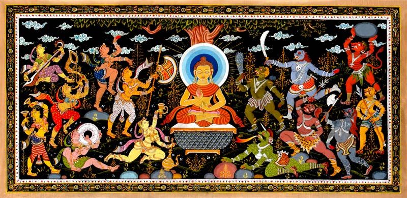 Lord Buddha in his meditation the artist using variegated colours and strong lines has painted posture and the laymen surrounding him. An attempt is being made to distract Lord Buddha but is of no avail as is evident by the figure of a woman offering him a drink. The strength of meditation has been aptly depicted by the artist with both the human beings and the demons trying their best to break his meditation. Patachitra paintings are on of the most impressive schools of paintings in India. Vibrant use of colours, strong lines, depiction of mythological figures and nature make this form of painting a popular art form.