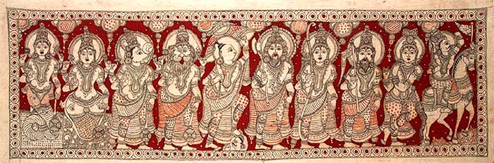 The beautiful Kalamkari painting depicts the ten incarnations of Vishnu. These incarnations detail the divine help given by Vishnu during various stages of human evolution, by appearing on earth in different forms to salvage the devotees from the impending catastrophe. These incarnations demonstrate that divinity re-establishes Dharma or righteousness and destroys injustice from time to time, by appearing on earth in various incarnations. The ten avataras are Matsyavatara (fish), Koorma (tortoise), Varaaha (boar), Narasimha (the man lion), Vaamana (the dwarf), Parasurama (the angry man), Rama (the perfect human), Balarama and Krishna (the divine statesman). The 10th avatar, which is yet to appear, is Kalki.Vishnu took up Matsyavatara, or the form of the fish during a deluge that submerged the earth. The Lord took selected specie in a huge boat. The gigantic golden fish then dragged the boat through the deluge and then enabled Bhrama to start the act of creation all over again. The Koorma Avatara where Vishnu took the form of a tortoise is described in the legend of the celestial nectar Amrita. Vishnu took the form of a wild boar - the Varaaha Avatara, dived into the ocean, and saved Bhoomi Devi who sank into the bottom of the ocean. In his Narasimhaavataaram, Vishnu destroyed the demon king Hiranyakashipu and demonstrated his omnipresence in a powerful way. Vishnu took the form of Vamana the midget to destroy the demon Bali. He visited Bali during a sacrifice where the latter was arrogantly distributing gifts of the seeker's choice, to show his power of wealth. Vamana meekly asked for three feet of land measured by his small feet. All on a sudden he assumed the massive form of Trivikrama, dominating the universe; with his first foot he covered the earth, with the second the heavens. When there was no room for the third, Bali, who never went back on his word, offered his head, and Vishnu sent him to the netherworld. Trivikrama is enshrined at Tirukkovilur, Kanchipuram and Sirkazhi in Tamilnadu.Vishnu then took up the form of Parasurama, to quell the arrogance of the Kshatriya rulers who harmed the sages and unprotected mortals. In His Rama Avatar, Vishnu killed Ravana. Lord Krishna was the eighth incarnation of Vishnu and the ninth was Buddha. Vishnu took up the avataar of Buddha to purify Hinduism of excessive ritualism. He preached detachment, and the middle path consisting of eight fold virtues of right views, right resolve, right speech, right conduct, right livelihood, right effort, right mindfulness and right meditation. It is believed that at the end of the current epoch, there will be a deluge when Kalki - the tenth and the last avatara of Vishnu, will ride forth on a horse to redeem humankind and re-establish righteousness.