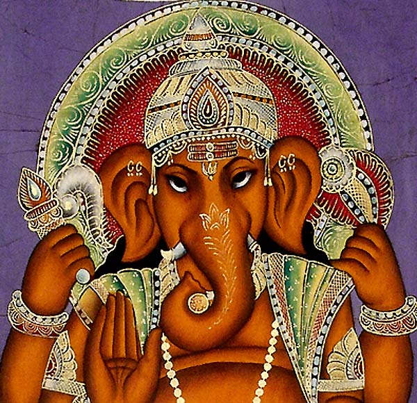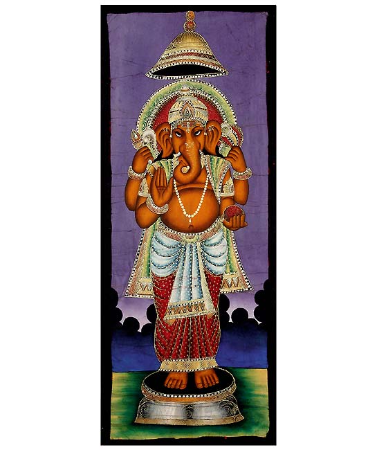 One of the most revered gods in Hinduism, Lord Ganesha, who is also called as the Lord of Wisdom and Remover of Obstacles, is given a refine and detail treatment in the beautiful batik painting. The Lord is standing and a deep sense of gracefulness and accomplishment is manifest in the Batik painting. He is wearing a red, and light colour draper and there are beautiful designs on the painting. Batik prints of West Bengal, Orissa and Tamil Nadu are known for their originality, uniqueness and fineness. Batik is the art of creating images on the cotton cloth using wax resist method.