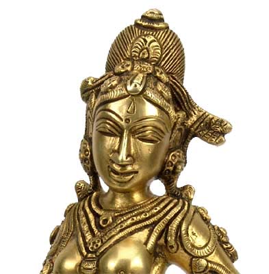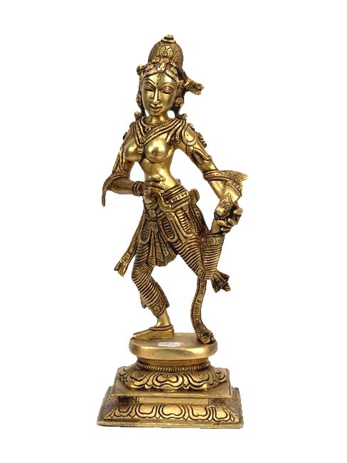The artist crafts the lady out of brass in a most graceful manner. Her pose, her elegance and her broad breasts all have been minutely chiseled out with a sense of great dedication. Crafted in a dancing pose, the lady is holding one leg on her left leg. Carefully crafted body, ornaments, plait of hair all has made the creation a unique one.