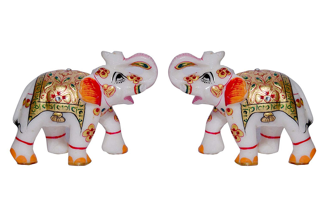 This pair of marble elephant is master craftsmanship with fine and beautiful work, this pure white rajastani marble royal elephant pair with beautiful hand painting on their back and trunk is an epitome of skilful craftsmanship. The sculpture features the royal elephants in all their glory and greatness. The sculptures will make a beautiful addition to your home decor.