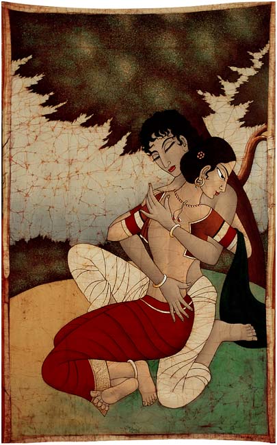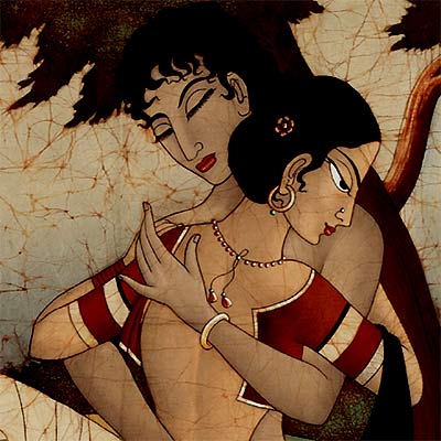 The beautiful, charming princess has surrendered herself completely into the strong arms of the handsome prince. A very intimate love scene is manifest in the beautiful Batik painting that plays with splendid colours. The handsome prince is holding her on his arms with lot of love and affection.
