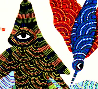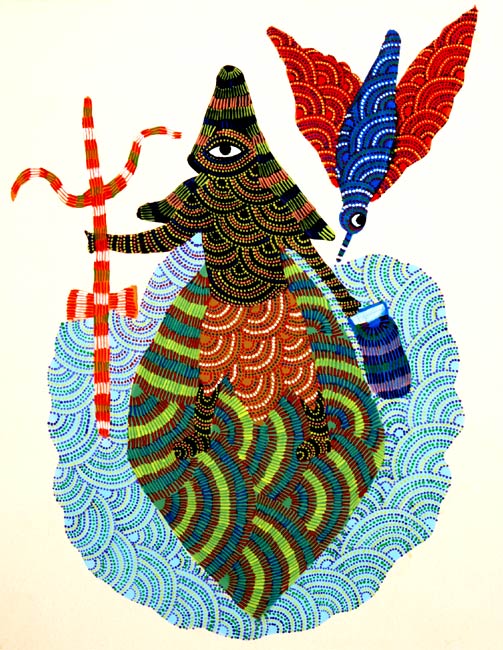 Lord Shiva is one of the most important gods in Hinduism and the God of destruction also occupies a place of importance in Gond society. The beautiful painting of the Lord is given a tribal treatment in the beautiful painting. The God is holding his trident (trishul) and dambaru as the bird is looking on.