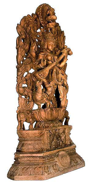 The spectacular wooden figure of the Goddess of Learning is given a beautiful treatment with some exquisite carvings. Refinement of the statue, the gracefulness of a woman, the sensuality and accomplishment are being aptly showcased in the beautiful wooden figure of the Goddess Saraswati. She is shown playing the vina. Her prominent breasts, dazzling ornaments, beautiful designs all make the figure a piece of beauty and sculptural excellence. The figure is full of life and her dancing posture reveals a deep sense of aesthetic beauty and grandeur. One of the most important goddesses in Hinduism, the Goddess Saraswati is worshipped by students and musicians alike.